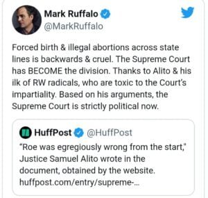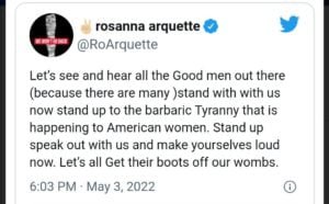 “Let’s see and hear all the Good men out there (because there are many )stand with us now stand up to the barbaric Tyranny that is happening to American women,” she tweeted. “Stand up speak out with us and make yourselves loud now. Let’s all Get their boots off our wombs.