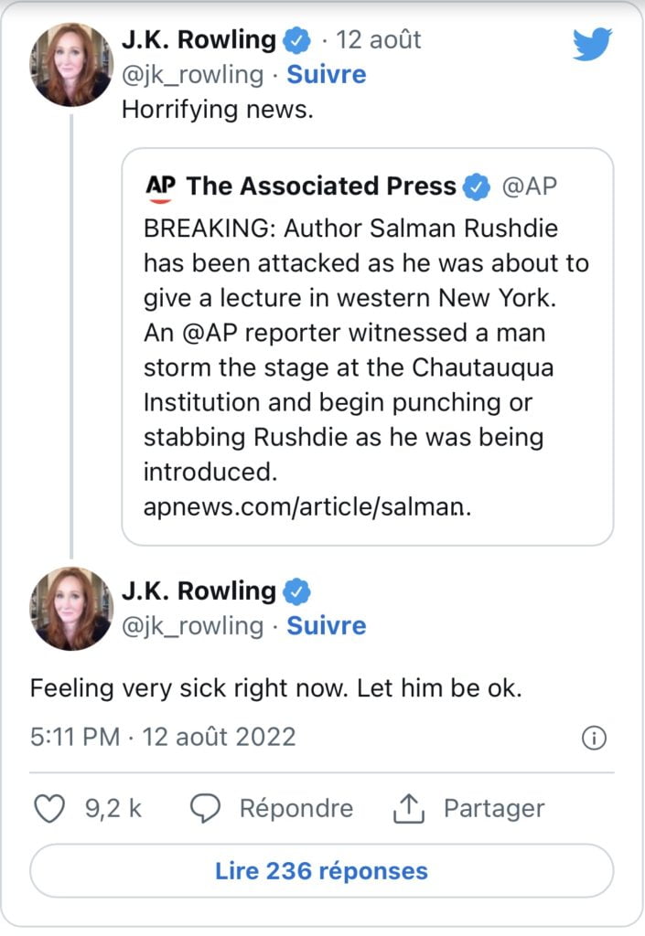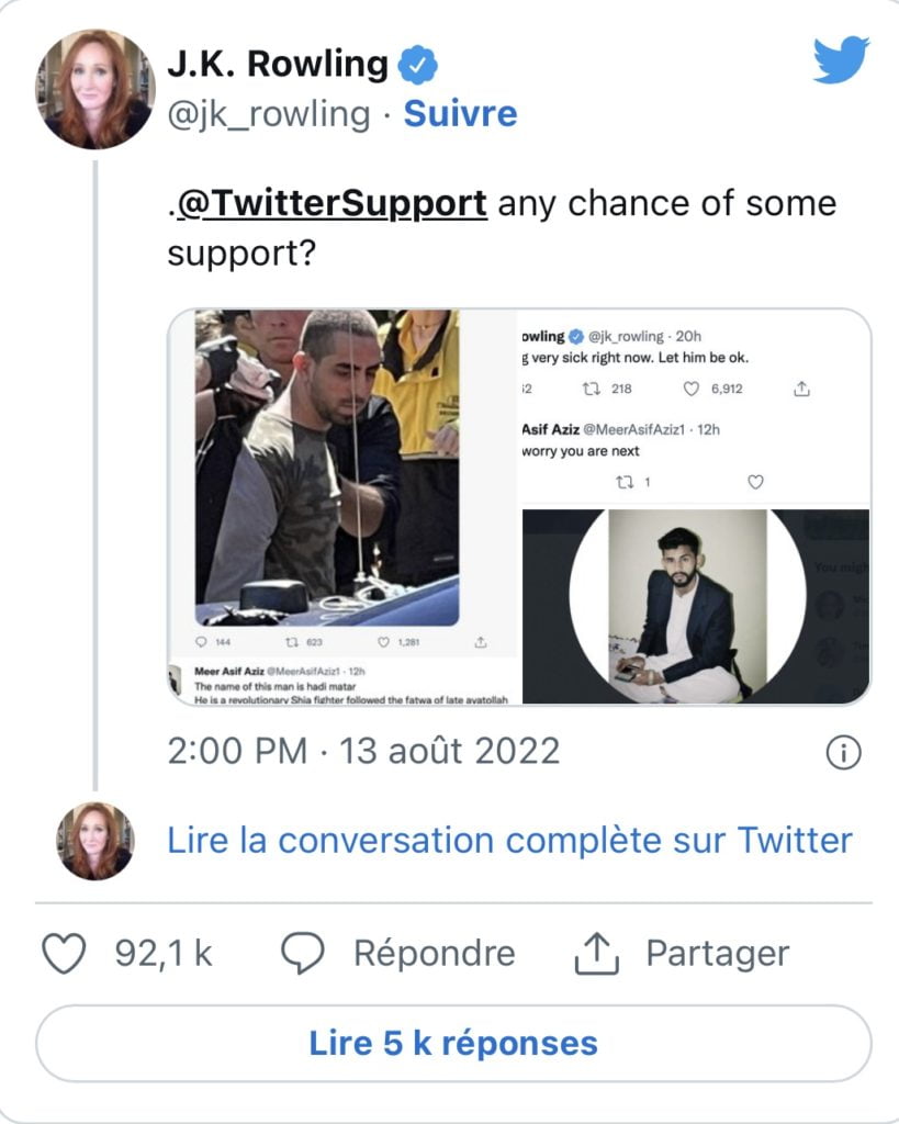 This Saturday, August 13, it is the British writer J.K. Rowling, known for being the author of the Harry Potter books, who paid the price. She testified the day before her indignation at the attack on her colleague by writing: “Horrible news. I feel very bad at the moment. May he be well.” Meer Asif Aziz replied, “Don’t worry, you’re next.” In reaction and to condemn these threats, J.K. Rowling, who took a screenshot of the posted messages, wrote: “@TwitterSupport any chance of support?”