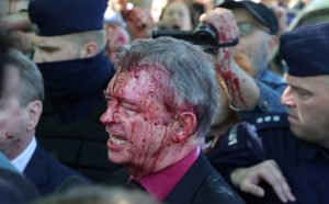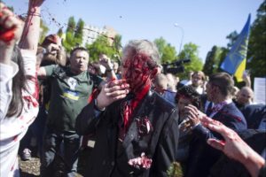 You are currently viewing Protesters cover the Russian ambassador with blood-red paint.